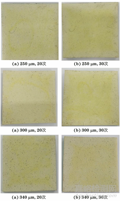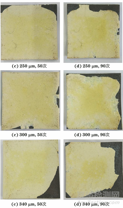 圖8 熱震循環(huán)不同次數(shù)后不同陶瓷涂層厚度8YSZ熱障涂層的表面宏觀形貌