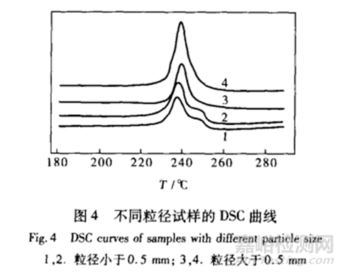 如上圖所示,圖中1和2曲線所用樣品的粒徑小于0.5mm;3和4曲線所用樣品的粒徑大于0.5mm;如上圖所示,當(dāng)樣品的粒徑大小不同,DSC曲線的峰形和峰頂位置明顯不同;粒徑小的樣品測(cè)試后的熔融峰呈雙峰,粒徑大的樣品測(cè)試后的熔融峰呈比較尖銳的單峰。