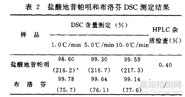 如下表所示,鹽酸地昔帕明為加熱易分解的藥物,選擇提高加熱速度可以避免分解,得到更準(zhǔn)確的結(jié)果,而且節(jié)約時(shí)間;而布洛芬則選用通常用的1℃/min即可。注意對(duì)不同類型的樣品進(jìn)行加熱速率的優(yōu)選,才能使結(jié)果更可靠。