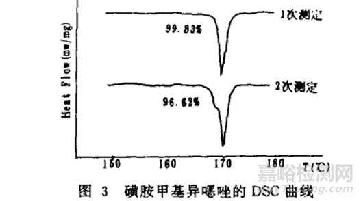DSC測(cè)試有時(shí)會(huì)進(jìn)行兩次升溫,第一次升溫使樣品融解,待樣品冷卻后再進(jìn)行第二次升溫測(cè)定。選擇二次測(cè)定是因?yàn)樵诘谝淮紊郎睾?,樣品融化,雜質(zhì)與純物質(zhì)重新結(jié)晶,粉狀或不規(guī)則形狀樣,可以與樣品盤均勻緊密的貼在一起,受熱更均勻,可以減小蓬松和接觸不良帶來的熱滯后。此外,二次測(cè)定可以更好地反映樣品在受熱時(shí)發(fā)生的變化。如樣品的純度增加時(shí),可能在受熱過程中雜質(zhì)發(fā)生揮發(fā);樣品純度降低時(shí),可能是受熱過程中,部分樣品發(fā)生分解。如下圖所示,磺胺甲基異噁唑二次測(cè)定時(shí),樣品發(fā)生部分分解,純度下降。