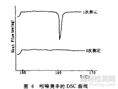 但要注意有些樣品在第一次升溫熔化后,不能重結(jié)晶,冷卻獲得的固體無定型樣品,在第二次升溫后不會(huì)發(fā)生熔化,如下圖中的吲哚美辛二次加熱測(cè)定的結(jié)果所示;因此此類樣品不能進(jìn)行二次加熱測(cè)定檢測(cè)。