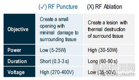 Baylis Medical Technologies為了解決射頻可能帶來(lái)的意外損傷(在組織中形成一個(gè)小開口,對(duì)周圍區(qū)域的損害最?。?,對(duì)PowerWire Pro射頻能量進(jìn)行設(shè)定。功率比射頻消融低,只有5-25W;時(shí)間更短,0.3-3S;電壓更高,270-400V。