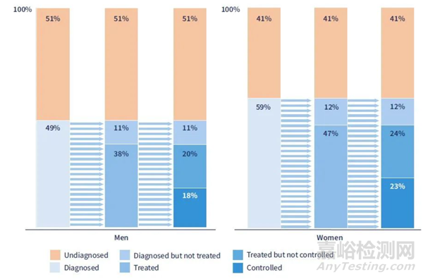 在30-79歲有高血壓的人群中,估計(jì)僅有54%的人被診斷,42%的人在接受降壓治療,21%的人高血壓得到控制。全球范圍內(nèi),女性高血壓患者中接受治療的比例估計(jì)為47%,而男性中僅為38%。在低收入國家,只有26%的成人高血壓患者接受治療,在高收入國家,這一比例為 58%。
