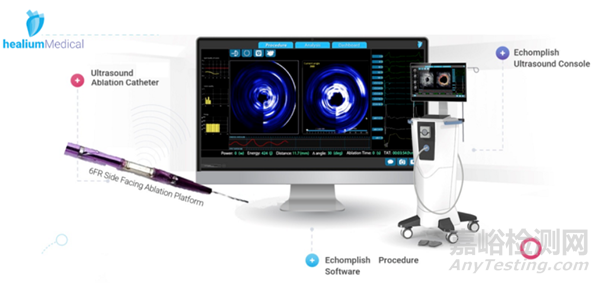 Renaly開發(fā)的新一代RDN器械基于超聲波能量系統(tǒng),其 Echomplish 雙模態(tài)超聲技術(shù)平臺(tái)可同時(shí)實(shí)現(xiàn)精準(zhǔn)超聲消融及超聲影像監(jiān)控。該器械由消融導(dǎo)管、控制臺(tái)以及軟件系統(tǒng)三部分構(gòu)成。通過成像軟件可以清晰地看到消融過程中的實(shí)時(shí)影像,利用超聲指示病灶位置,并采用病變評(píng)分系統(tǒng)讓術(shù)者了解手術(shù)情況。目前,該產(chǎn)品處于動(dòng)物試驗(yàn)階段,設(shè)計(jì)已基本定型,即將進(jìn)入人體研究階段。