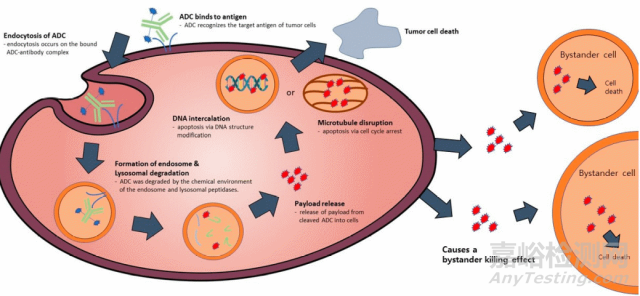 ADC藥物中的單克隆抗體表現出選擇性附著和進入抗原過度表達的癌細胞的能力。ADC藥物隨后通過一系列細胞內化過程被帶入腫瘤細胞內,這一過程從早期含體形成開始,發(fā)展到晚期內含體的成熟,并最終與溶酶體融合。ADC的有效載荷在溶酶體內通過化學或酶作用發(fā)生裂解,釋放后,這種有效載荷通過破壞目標細胞內的DNA或微管發(fā)揮其細胞毒性,最終導致癌細胞的死亡(圖2)。此外,如果釋放的有效載荷具有透過細胞膜的能力,它還能引發(fā)“旁觀者效應”,即不需要ADC的內化作用就能引起鄰近的靶細胞發(fā)生凋亡。因此,由于ADC藥物精準的抗體結合和有效載荷的促凋亡能力,它在癌癥治療方面具有多種優(yōu)勢,包括治療窗口及療效增強,耐藥性降低,癌細胞特異性靶向,對正常細胞的毒性相對較低,與傳統(tǒng)化學癌癥治療相比,副作用較小等[5]。