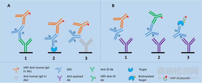 對于總抗體和ADC部分的檢測,通常采用ELISA或MSD平臺。針對總抗體,通常利用靶點或抗裸抗的特異性抗體作為捕獲試劑進行包被,再選擇酶標的抗裸抗特異性抗體或普抗作為檢測抗體進行檢測(圖3A)。針對ADC,通常利用抗payload特異性抗體作為捕獲抗體進行包被,再選擇酶標的抗裸抗特異性抗體、普抗或者靶點作為檢測抗體進行檢測(圖3B)。以已上市的ADC藥物Enhertu為例,它的主體是抗Her2抗體,有效載荷為Dxd,該上市藥物的PK檢測中,總抗體和ADC的檢測是在ECL平臺進行的,總抗體的檢測中分別使用anti-HER2 antibody的特異性單克隆抗體作為捕獲試劑和檢測試劑,而ADC的檢測中使用抗小分子抗體anti-Dxd antibody作為捕獲抗體,檢測抗體則使用測的是anti-HER2 antibody的單克隆抗體。