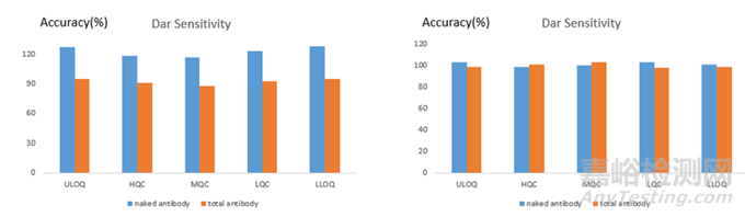 首先對于ADC的檢測,可以使用靶點蛋白作為捕獲試劑,抗小分子毒素的抗體作為檢測試劑,也可以使用抗小分子毒素的抗體作為捕獲試劑,使用靶點蛋白作為檢測試劑,往往后者在DAR敏感性測試中有比較好的結果,圖4是在一款ADC的PK檢測中使用2種不同assay format在DAR敏感性中的差異。從圖中可以看出,當使用靶點蛋白作為捕獲試劑,抗小分子毒素的抗體作為檢測試劑時,隨著DAR值的降低,QC的回收率也隨之降低;當使用抗小分子毒素的抗體作為捕獲試劑時,不同DAR值的ADC間的QC差異較小,整體的回收率都在80%-120%之間。這和文獻中的報道也比較一致,在ADC的檢測中建議使用抗小分子藥物的抗體作為包被試劑,不同ADC間檢測的結果更加一致。