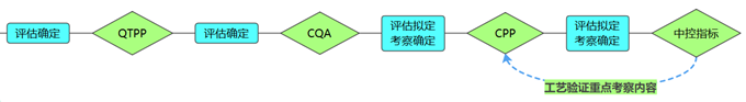 關(guān)于這些隱性前提條件,由于內(nèi)容過于豐富就不再全面介紹,只針對其中非常關(guān)鍵的一個(gè)進(jìn)行說明——風(fēng)險(xiǎn)評估。說到風(fēng)險(xiǎn)評估,可能較為普遍的看法是:一個(gè)玄乎其玄的東西,憑空想想,列出幾條風(fēng)險(xiǎn)和對應(yīng)措施就可以了。一些比較嚴(yán)謹(jǐn)或資深的同行,或許會(huì)認(rèn)真的按照ICH Q9《質(zhì)量風(fēng)險(xiǎn)管理》相關(guān)流程進(jìn)行。對于工藝驗(yàn)證的風(fēng)險(xiǎn)評估,我不想說些常規(guī)的,而是傾向于從QbD理念出發(fā),簡單分享一下通過風(fēng)險(xiǎn)評估確定工藝驗(yàn)證考察因素的思路。思路流程圖如下: