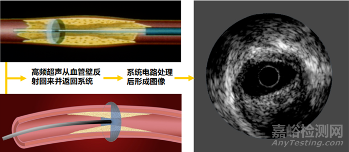 IVUS其成像原理與基于超聲的其它成像方式相同,即導(dǎo)管頭端換能器從控制臺(tái)接受電信號(hào),通過(guò)電刺激使得換能器中的壓電晶體膨脹和收縮以產(chǎn)生高頻超聲波,隨后這些超聲波于組織界面處散射和反射,部分反射回的超聲波由換能器再轉(zhuǎn)換回電信號(hào),最終由控制臺(tái)中的成像引擎分析處理,轉(zhuǎn)化為灰度橫截面圖像。