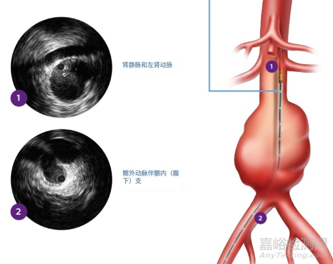 3.IVUS成像:確定真管腔與假管腔的位置,提供實(shí)時(shí)直徑測(cè)量,評(píng)估血管形態(tài)。利用IVUS的成像功能,在IVUS引導(dǎo)的EVAR過(guò)程中幫助減少輻射;并且不透射線和墨水的導(dǎo)管軸標(biāo)記有利于低對(duì)比度和低輻射操作。