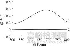 1—PVA標準工作液;2—可降解聚酯原料溶液圖1 PVA紫外-可見吸收光譜圖