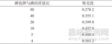 Tab. 1 Absorbance at different mass ratios of KI/I2