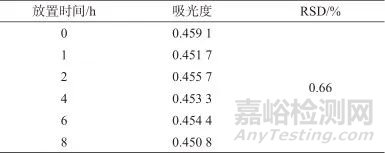取質量濃度為0.101 2 mg/mL的PVA標準工作液,分別于0、1、2、4、6、8 h,按1.3方法,于650 nm波長處測定吸光度,8 h內的測定結果列于表2。結果表明,在8 h內吸光度值基本不變,相對標準偏差為0.66%,說明溶液穩(wěn)定性良好。