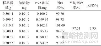 筆者除通過調節(jié)顯色劑中碘與碘化鉀的比率解決絮狀沉淀干擾問題外,還進一步結合材料特性,篩選比較了超聲處理與加熱攪拌處理對PVA溶出的影響,提高了方法的回收率,并系統(tǒng)地進行了方法學研究,建立了一種適用于可降解聚酯中PVA殘留量測定的方法,為可降解聚酯的質量控制及工藝優(yōu)化提供參考和保障。