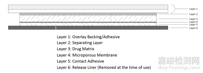 第一層為包裝背襯/粘合層,第二層為隔離層,第三層為藥物層,第四層為微孔控釋膜,第五層為皮膚粘合層,第六層為背襯層(用時(shí)撕開棄用)。