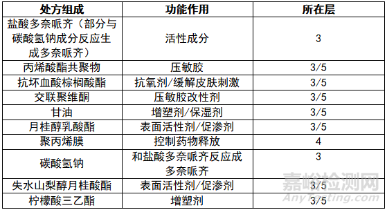 透皮貼劑為一般三層或五層貼劑,而多奈哌齊貼劑具有六層。根據(jù)多奈哌齊貼劑說(shuō)明書顯示如圖。