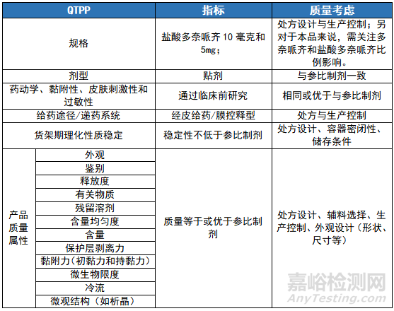 目標(biāo)產(chǎn)品質(zhì)量屬性(QTPP)是透皮制劑技術(shù)開發(fā)的一個(gè)基本要素,構(gòu)成了產(chǎn)品研發(fā)的設(shè)計(jì)基礎(chǔ)。對(duì)于多奈哌齊貼劑項(xiàng)目,產(chǎn)品主要的QTPP屬性分析如下表所示: