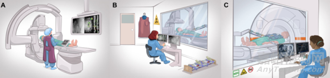 技術(shù)的最新進(jìn)展使機(jī)器人輔助血管內(nèi)和非血管介入手術(shù)的得到改進(jìn)。IR中的機(jī)器人系統(tǒng)可以解決該領(lǐng)域很多的缺點(diǎn),即患者和醫(yī)護(hù)人員都暴露在電離輻射中(圖A)。此外,在IR中使用機(jī)器人系統(tǒng)的其他潛在好處包括提高治療精度,減少操作時(shí)間,以及減少達(dá)到目標(biāo)所需的重新調(diào)整次數(shù)。