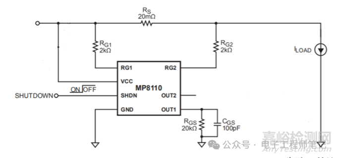 由于MP8110芯片在電流檢測的功能電路應(yīng)用中,被檢測的對象為電阻,屬于阻性負(fù)載,非感性負(fù)載,因此工程師在具體電路設(shè)計(jì)的過程中,只需使用MP8110芯片的Pin 5引腳OUT1功能,不需要Pin 8引腳OUT2的電路功能。