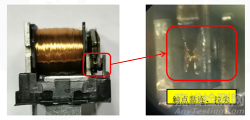 一般為繼電器線圈端故障導(dǎo)致繼電器無法吸合接通,失效的主要原因有過電壓或超聲波清洗導(dǎo)致的線圈斷線、電壓不符合繼電器要求導(dǎo)致的吸合力不足。