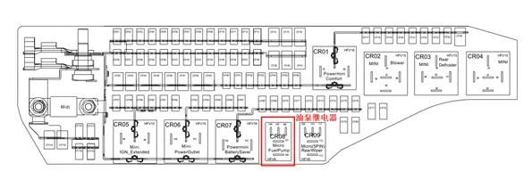 某車型在耐久路試過程中發(fā)現(xiàn)整車存在偶發(fā)不能起動(dòng)或熄火的問題,經(jīng)排查為電器盒中的油泵繼電器無電壓輸出導(dǎo)致,具體入下圖所示:
