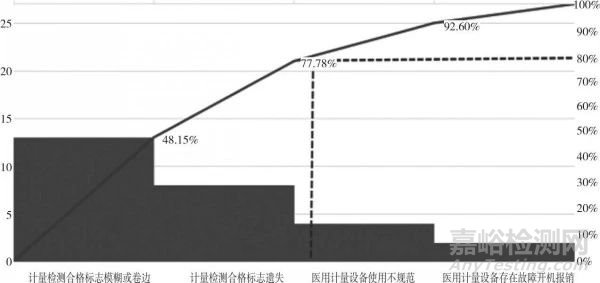 利用柏拉圖對(duì)存在問(wèn)題進(jìn)行主次因素判定(見(jiàn)圖1),可知計(jì)量檢測(cè)合格標(biāo)志模糊或卷邊、計(jì)量檢測(cè)合格標(biāo)志遺失、醫(yī)用計(jì)量設(shè)備使用不規(guī)范這些問(wèn)題的累計(jì)構(gòu)成比為80%,基于80/20原則,將其確定為醫(yī)用計(jì)量設(shè)備不合格的主要因素。