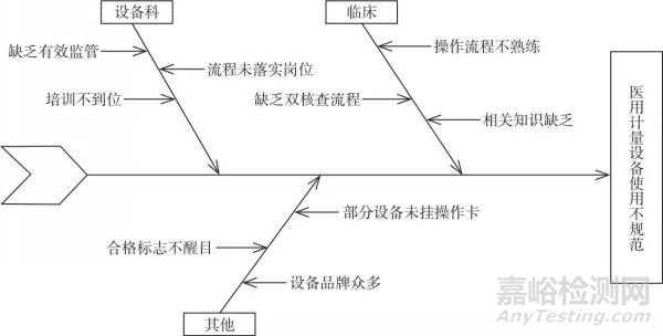 運(yùn)用魚骨圖分析不合格情況,依次構(gòu)建計(jì)量檢測(cè)合格標(biāo)志模糊或卷邊原因分析(見(jiàn)圖2),計(jì)量檢測(cè)合格標(biāo)志遺失原因分析(見(jiàn)圖3),醫(yī)用計(jì)量設(shè)備使用不規(guī)范原因分析(見(jiàn)圖4)。計(jì)量PDCA小組分析認(rèn)為主要原因有以下幾點(diǎn):①計(jì)量設(shè)備管理制度不夠完善。對(duì)于新購(gòu)計(jì)量設(shè)備的管理存在漏洞,特別是首次檢定存在漏檢現(xiàn)象。在制度中無(wú)明確獎(jiǎng)懲措施,導(dǎo)致工作中出現(xiàn)醫(yī)務(wù)人員不配合、責(zé)任意識(shí)差等。②計(jì)量管理相關(guān)培訓(xùn)不足。對(duì)臨床科室的計(jì)量培訓(xùn)缺失,導(dǎo)致臨床對(duì)于計(jì)量管理相關(guān)知識(shí)欠缺和風(fēng)險(xiǎn)意識(shí)不強(qiáng)。③大部分臨床科室未設(shè)置科內(nèi)醫(yī)用計(jì)量設(shè)備管理員。各臨床科室無(wú)專人兼管計(jì)量工作,致使對(duì)科內(nèi)醫(yī)用計(jì)量設(shè)備狀況和臺(tái)數(shù)掌握不清,易出現(xiàn)自查漏洞。④檢查力度不夠。設(shè)備科的計(jì)量巡檢工作不夠完善,特別是對(duì)一些小型計(jì)量設(shè)備的檢查存在疏漏。臨床對(duì)小型計(jì)量設(shè)備如壓力表、氧氣表等經(jīng)常要使用消毒濕巾擦拭消毒,計(jì)量檢測(cè)合格標(biāo)志經(jīng)擦拭后容易模糊或卷邊。