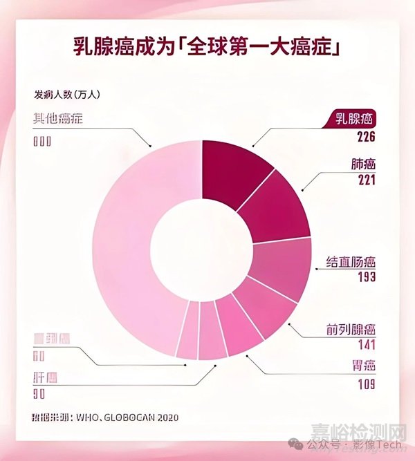 據(jù)世界衛(wèi)生組織國際癌癥研究機(jī)構(gòu)(IARC)數(shù)據(jù)顯示,每年有約228萬名女性被診斷出患有乳腺癌,2020年全球新增癌癥人數(shù)共計(jì)1929萬人,其中乳腺癌新增患者數(shù)達(dá)226萬,已超過肺癌,躍居腫瘤首位。