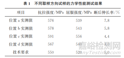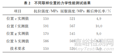(2)當(dāng)拉伸試樣的切取位置太貼近鍛坯表面時(shí),該試樣的抗拉強(qiáng)度、屈服強(qiáng)度以及斷后伸長(zhǎng)率均偏低,得到的檢測(cè)結(jié)果不能用來評(píng)估鍛件的真實(shí)性能。當(dāng)試樣的切取位置在變形良好區(qū)域,但又沒完全在鍛坯幾何中心時(shí),所檢測(cè)結(jié)果也不能如實(shí)反映零件的性能。