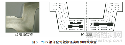 7055鋁合金輪轂鍛坯實(shí)物和流線如圖5所示,圖中i、j、k是截面上不同規(guī)格的3根試樣所在位置。表3為3個(gè)不同規(guī)格試樣的力學(xué)性能測(cè)試結(jié)果。由表3可知:標(biāo)距為30mm和40mm拉伸試樣的力學(xué)性能相當(dāng),斷后伸長(zhǎng)率分別為11.5%和12.5%,而標(biāo)距為50mm的拉伸試樣斷后伸長(zhǎng)率只有3.0%,且k號(hào)試樣斷裂的位置在標(biāo)點(diǎn)處。