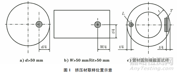 對(duì)力學(xué)性能檢測(cè)試樣的取樣方式進(jìn)行規(guī)定是合理評(píng)價(jià)零件或材料性能的基礎(chǔ)。管材、棒材和型材都屬于基礎(chǔ)原材料,GB/T 16865—2013 《變形鋁、鎂及其合金加工制品 拉伸試驗(yàn)用試樣及方法》和GB/T 2975—2018《鋼及鋼產(chǎn)品 力學(xué)性能試驗(yàn)取樣位置及試樣制備》中已對(duì)力學(xué)性能試驗(yàn)取樣位置進(jìn)行了詳細(xì)規(guī)定。擠壓材取樣位置如圖1所示,通常只規(guī)定擠壓材的縱向性能,且截面為相對(duì)規(guī)則的形狀,因此取樣位置都在相應(yīng)的幾何對(duì)稱部位。對(duì)于鍛件,很難在國(guó)家標(biāo)準(zhǔn)中明確規(guī)定毛坯的取樣位置,而且鍛件有其特殊性,難以標(biāo)準(zhǔn)化。