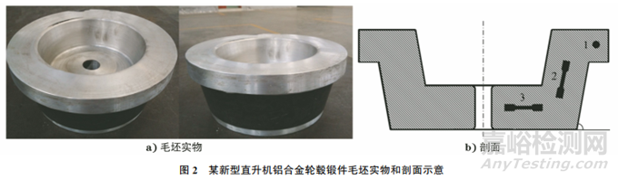 對(duì)于鍛件,尤其是模鍛件,在鍛造方案的制定過程中,會(huì)根據(jù)零件形狀、尺寸規(guī)格設(shè)計(jì)其模具和鍛造工序,讓金屬的變形流線與零件負(fù)載情況相契合,因此鍛件的力學(xué)性能可能處處不相同。沒有相應(yīng)的標(biāo)準(zhǔn)規(guī)定模鍛件的取樣方式,通常是用戶與鍛件提供方協(xié)商確定取樣位置。然而,必須要依據(jù)一定的原則確定取樣方式。某新型直升機(jī)鋁合金輪轂鍛件毛坯實(shí)物和剖面如圖2所示,圖2中1,2,3位置為力學(xué)性能檢測(cè)試樣位置,分別為輪轂外緣切向、輪轂壁高方向、輪轂底部徑向。在飛機(jī)滑跑過程中或者剎車時(shí),飛機(jī)機(jī)輪外緣會(huì)受到地面切向的摩擦力,此時(shí)要確認(rèn)機(jī)輪受切向載荷時(shí)的服役情況,由此確定取樣位置1;機(jī)輪輪轂外緣有一定錐度,機(jī)輪在服役過程中有向外壓出的趨勢(shì),輪轂軸向受拉力作用,確定了取樣位置2;當(dāng)飛機(jī)垂直起降或者靜止時(shí),以地面為切面,機(jī)輪受到指向圓心的力,此時(shí)要確認(rèn)機(jī)輪徑向負(fù)載情況,所以確定取樣位置3。