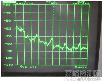 于是用頻譜分別對MOS管的G、D、S三個腳接觸看一下是哪個腳是輻射源,發(fā)現(xiàn)D極的輻射源最大。于是我在D極上串了一個通用的插件磁珠。(¢3.5*8)再看MOS管的頻譜曲線如下: