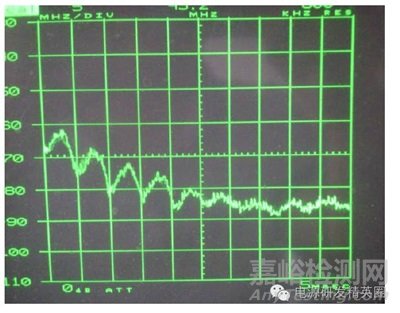 根據(jù)以上的情況我做了第二次修改,將變壓器更新成我前面提到過的改變了繞線方式的變壓器。用我的頻譜分析儀重新查看了一產(chǎn)品的變壓器的位置和MOS管的位置。發(fā)現(xiàn)MOS管的位置曲線不是有點(diǎn)高,并且成有規(guī)律的波形