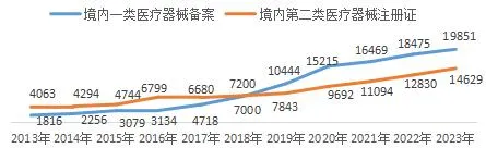 圖 2-1 2013-2023 年國(guó)產(chǎn)一、二類醫(yī)療器械數(shù)量變化趨勢(shì) 單位:件
