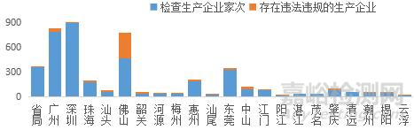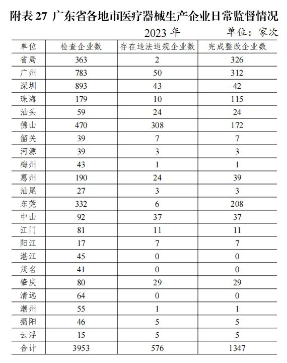 從各區(qū)域上看,2023 年全省各級(jí)監(jiān)管機(jī)構(gòu)共檢查醫(yī)療器械生產(chǎn)企業(yè) 3953 家次,其中檢查企業(yè)家次靠前的地市為深圳、廣州、佛山,三個(gè)地市的檢查數(shù)共計(jì) 2146 家次,占全省的 54.3%;發(fā)現(xiàn)違法違規(guī)的生產(chǎn)企業(yè)共計(jì) 576 家次,占檢查總家次的14.6%,其中發(fā)現(xiàn)違法違規(guī)企業(yè)數(shù)最多的地市為佛山、廣州和深圳,三個(gè)地市發(fā)現(xiàn)違法違規(guī)企業(yè)為 401 家次,占全省發(fā)現(xiàn)違法違規(guī)總家次的 69.6%,詳見圖 2-3、附表 27。