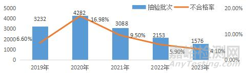 2023 年全省共抽驗(yàn)主體數(shù) 1174 家,檢驗(yàn)醫(yī)療器械 1576 批次,不合格64批次,不合格率4.1%,不合格率比去年下降30.5%。近 5 年全省醫(yī)療器械抽驗(yàn)不合格率如圖 2-5 所示。詳見附表 30。