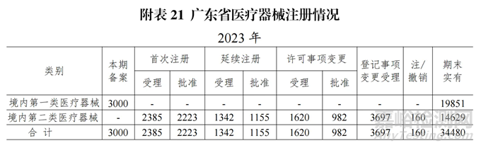 2023 年度全省共批準(zhǔn)二類醫(yī)療器械首次注冊(cè)/備案 2223 件,延續(xù)注冊(cè) 1155 件,許可事項(xiàng)變更 982 件。截至 2023 年 12 月底,全省共有境內(nèi)一類醫(yī)療器械備案 19851 件,二類醫(yī)療器械注冊(cè)證 14629 件。詳見附表 21。