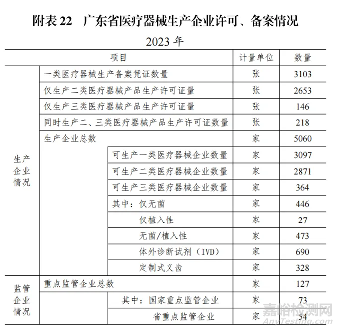 醫(yī)療器械生產(chǎn)企業(yè)中,可生產(chǎn)一類 3097 家,可生產(chǎn)二類2871 家,可生產(chǎn)三類 364 家。其中僅無菌 446 家,僅植入性 27家,無菌/植入性 473 家,體外診斷試劑(IVD)690 家,定制式義齒 328 家,重點(diǎn)監(jiān)管企業(yè)總數(shù) 127 家。詳見附表 22。