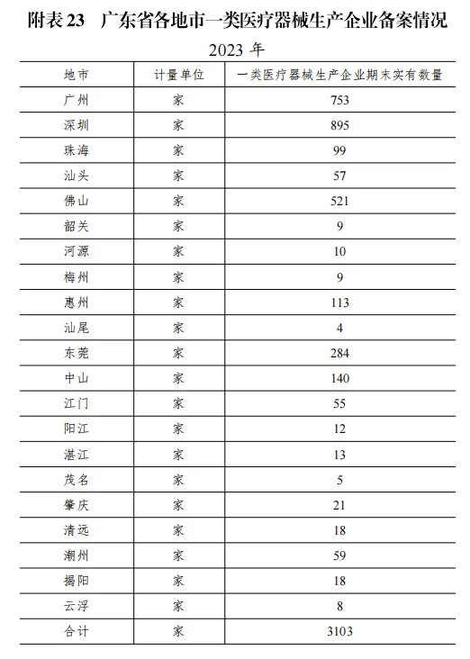 截止 2023 年底全省實(shí)有醫(yī)療器械生產(chǎn)企業(yè) 5060 家,同比增加 1.9%,一類醫(yī)療器械生產(chǎn)備案憑證 3103 張,其中一類企業(yè)數(shù)靠前的地市為深圳、廣州、佛山,三個(gè)地市的總數(shù)為 2169張,占全省的 70%,詳見附表 23;僅生產(chǎn)二類醫(yī)療器械產(chǎn)品生產(chǎn)許可證 2653 張,僅生產(chǎn)三類醫(yī)療器械產(chǎn)品生產(chǎn)許可證 146 張,同時(shí)生產(chǎn)二、三類醫(yī)療器械產(chǎn)品生產(chǎn)許可證 218 張。