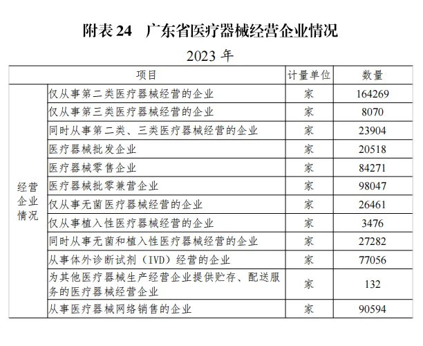 截至 2023 年底全省共有二、三類醫(yī)療器械經(jīng)營(yíng)企業(yè) 196243家,其中,僅經(jīng)營(yíng)二類醫(yī)療器械產(chǎn)品的企業(yè) 164269 家,僅經(jīng)營(yíng)三類醫(yī)療器械產(chǎn)品的企業(yè) 8070 家,同時(shí)從事第二、三類醫(yī)療器械經(jīng)營(yíng)的企業(yè) 23904 家。詳見附表 24。