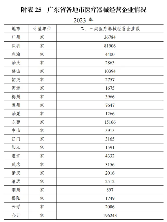 從各區(qū)域上看,截至 2023 年 12 月底,全省二、三類醫(yī)療器械經(jīng)營(yíng)企業(yè)總數(shù)為 196243 家,其中總數(shù)靠前的地市為深圳(81906 家)、廣州(36784 家)、東莞(15166 家),三個(gè)地市企業(yè)數(shù)共計(jì) 133856 家,占全省總數(shù)的 68.2%,詳見圖 2-2、附表 25。