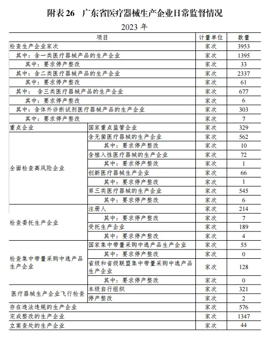 2023 年度各級(jí)監(jiān)管機(jī)構(gòu)共檢查醫(yī)療器械生產(chǎn)企業(yè) 3953 家次,檢查國(guó)家重點(diǎn)監(jiān)管企業(yè) 329 家次,全面檢查高風(fēng)險(xiǎn)企業(yè)中含無菌醫(yī)療器械生產(chǎn)企業(yè) 562 家次,檢查含植入性醫(yī)療器械生產(chǎn)企業(yè) 72 家次,創(chuàng)新醫(yī)療器械 66 家次,第三類醫(yī)療器械的生產(chǎn)企業(yè) 545 家。全年存在違法違規(guī)生產(chǎn)企業(yè) 576 家次,完成整改 1347 家次,立案查處生產(chǎn)企業(yè) 44 家次。詳見附表 26。