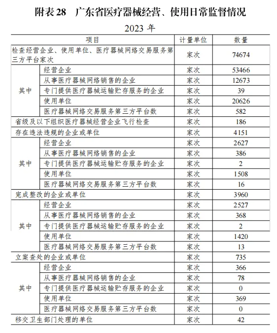 2023 年度各級(jí)監(jiān)管機(jī)構(gòu)共檢查醫(yī)療器械經(jīng)營(yíng)企業(yè) 74674 家次,發(fā)現(xiàn)存在違規(guī)行為的企業(yè) 4151 家次,完成整 3960 家次,全年度立案查處 735 家次;其中各級(jí)監(jiān)管機(jī)構(gòu)共檢查經(jīng)營(yíng)企業(yè)53466 家次,發(fā)現(xiàn)存在違規(guī)行為的單位 2627 家次,完成整改 2527家次,全年度立案查處的單位 366 家次;各級(jí)監(jiān)管機(jī)構(gòu)共檢查從事醫(yī)療器械網(wǎng)絡(luò)銷售的企業(yè) 12673 家次,發(fā)現(xiàn)存在違法違規(guī)的企業(yè) 386 家次,完成整改 368 家次,全年度立案查處的單位78 家次;各級(jí)監(jiān)管機(jī)構(gòu)共檢查專門提供醫(yī)療器械運(yùn)輸貯存服務(wù)的企業(yè) 39 家次,發(fā)現(xiàn)存在違規(guī)行為的單位 2 家次,完成整改 2家次,全年度沒有立案查處專門提供醫(yī)療器械運(yùn)輸貯存服務(wù)的企業(yè);各級(jí)監(jiān)管機(jī)構(gòu)共檢查使用單位 20626 家次,發(fā)現(xiàn)存在違法違規(guī)的單位 1508 家次,完成整改 1420 家次,全年度立案查處的單位 369 家次;各級(jí)監(jiān)管機(jī)構(gòu)共檢查醫(yī)療器械網(wǎng)絡(luò)交易服務(wù)第三方平臺(tái)數(shù) 582 家次,發(fā)現(xiàn)存在違規(guī)行為的單位 16 家次,完成整改 13 家次,全年度沒有立案查處的平臺(tái),詳見附表 28。
