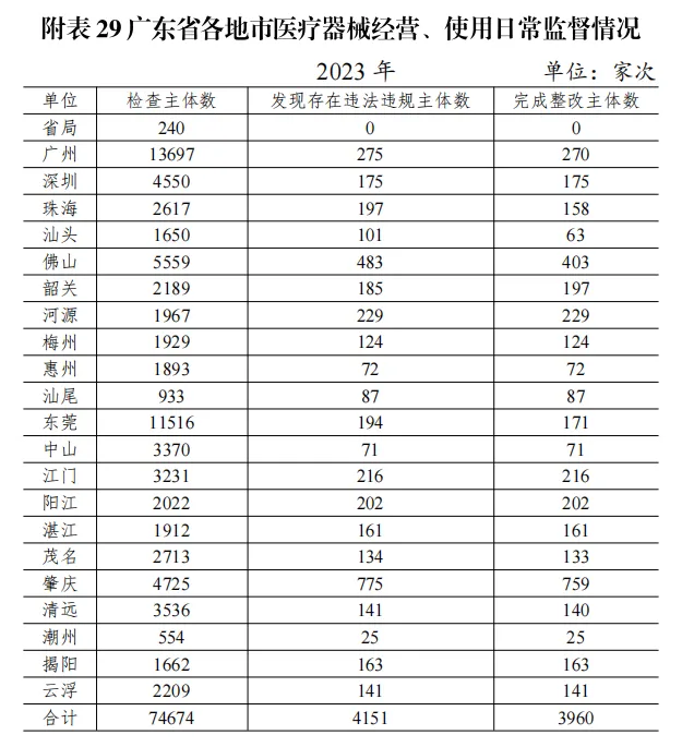 從各區(qū)域上看,截至 2023 年 12 月底,全省各級(jí)監(jiān)管機(jī)構(gòu)共檢查醫(yī)療器械經(jīng)營(yíng)、使用單位、醫(yī)療器械網(wǎng)絡(luò)交易服務(wù)第三方平臺(tái) 74674 家次,其中檢查數(shù)量靠前的地市為廣州和東莞,兩個(gè)地市的檢查數(shù)共計(jì) 25213 家次,占全省的 33.8%;發(fā)現(xiàn)違法違規(guī)的主體數(shù)共計(jì) 4151 家次,占檢查總家次的 5.6%,其中違法違規(guī)企業(yè)數(shù)靠前的地市為肇慶、佛山、廣州,三個(gè)地市發(fā)現(xiàn)違法違規(guī)主體數(shù)為 1533 家次,占全省發(fā)現(xiàn)違法違規(guī)總家次的37%,詳見圖 2-4、附表 29。