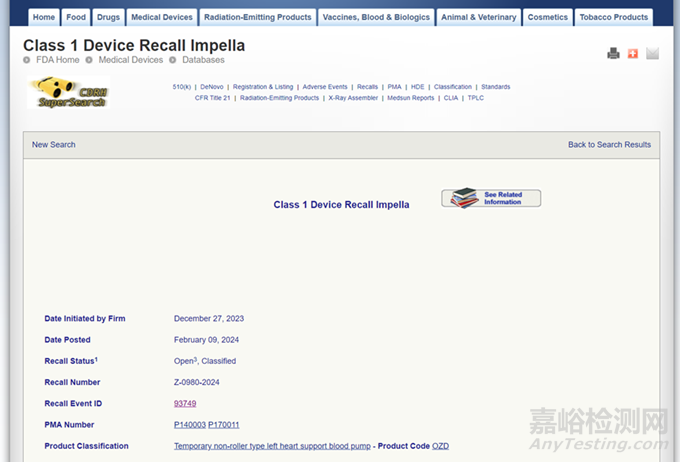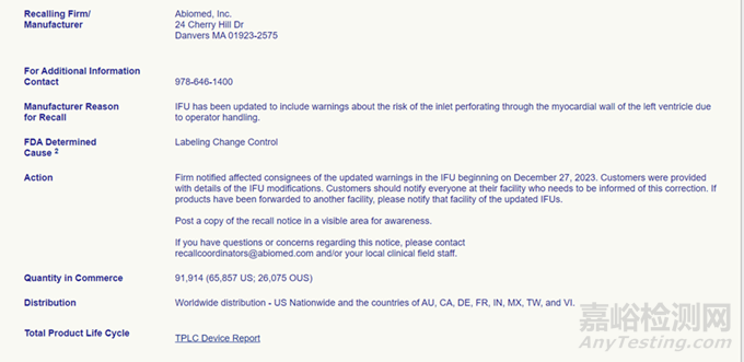 2024年3月21日,美國食品和藥物管理局(FDA)宣布一級召回,Abiomed將召回其針對Impella左側(cè)血泵的說明書。向所有受影響的客戶發(fā)送了新的和修訂的使用說明(IFU)。因?yàn)楸脤?dǎo)管可能會刺穿(切割)心臟左心室壁。FDA 已將其確定為 I 級召回(最緊急的召回類型),使用或接觸違規(guī)產(chǎn)品將導(dǎo)致嚴(yán)重的不良健康后果或死亡。