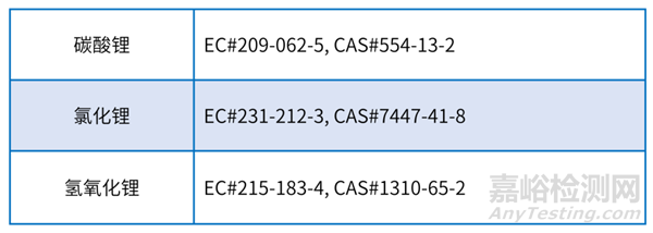 碳酸鋰、氯化鋰和氫氧化鋰被廣泛用于半導(dǎo)體、醫(yī)藥、玻璃和建筑行業(yè),其中碳酸鋰和氫氧化鋰又是制備動力電池的重要原料。而根據(jù)REACH法規(guī)附件VXII限制清單Entry 30規(guī)定,被分類為生殖毒性1A及1B的物質(zhì)不能作為物質(zhì)本身、其他物質(zhì)的成分或配置品組分投放市場或使用。