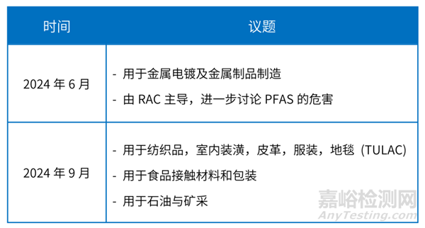 更多關(guān)于PFAS限制提案內(nèi)容的評議將在今年后續(xù)會議中討論,會議時間及可能涉及的議題見下表: