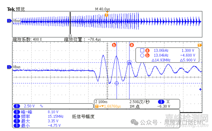 示波器測(cè)量到的某電壓輸出寄生振蕩波形圖