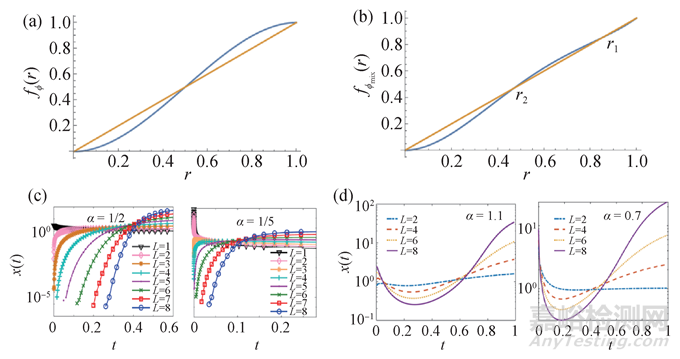 圖3 (a)和(b)展示相鄰兩層子系統(tǒng)的可靠度關(guān)系示意圖,根據(jù)Box 2中的分析,圖中藍(lán)色曲線與黃色直線的交點(diǎn)即為不動(dòng)點(diǎn)。圖(a)中的f?(r)在0<r<1范圍內(nèi)有一個(gè)不動(dòng)點(diǎn),圖(b)中的f?(r)在該范圍內(nèi)有兩個(gè)不動(dòng)點(diǎn),對(duì)應(yīng)圖中的r1和r2。假設(shè)部件壽命是威布爾分布r(t)=exp(-tα)(這里時(shí)間t已被無(wú)量綱處理),它對(duì)應(yīng)的部件失效率是αtα-1,當(dāng)0<α<1時(shí),部件失效率隨時(shí)間遞減,當(dāng)α>1時(shí),部件失效率隨時(shí)間遞增。(c)和(d)展示多層系統(tǒng)的失效率時(shí)間變化趨勢(shì)。其中圖(c)中每一層結(jié)構(gòu)對(duì)應(yīng)于(a),這類結(jié)構(gòu)函數(shù)在r(t)小于不動(dòng)點(diǎn)時(shí),會(huì)抑制系統(tǒng)失效風(fēng)險(xiǎn)。從(c)中可以看出,隨著層數(shù)L的增加,系統(tǒng)早期失效率受抑制效果變得顯著。當(dāng)層數(shù)足夠多時(shí),系統(tǒng)失效率呈遞增趨勢(shì),這一趨勢(shì)不依賴于部件層次的細(xì)節(jié)參數(shù)α。圖(d)中每一層結(jié)構(gòu)對(duì)應(yīng)于(b),這種結(jié)構(gòu)函數(shù)在r2<r(t)<r1范圍內(nèi),會(huì)抑制系統(tǒng)失效風(fēng)險(xiǎn),在此范圍以外,會(huì)增加系統(tǒng)失效風(fēng)險(xiǎn)。因此如圖(d)中當(dāng)層數(shù)足夠多時(shí),無(wú)論部件失效率遞增(α=1.1)還是遞減(α=0.7),系統(tǒng)的失效率曲線都是浴盆曲線[18]